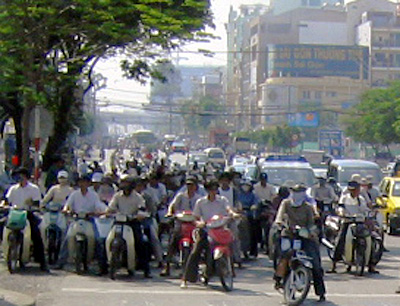 ↑ホーチミンの街中で信号待ちをしているバイク集団